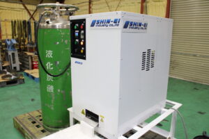小型のドライアイス製造機を製造し、ENEOSとの共同事業を開始しました。 ドライアイスを専用ジャケットに入れて着用すると熱中症予防に高い効果が得られます。 輸送する手間やコストが課題でしたが、小型化したことで、各現場に設置でき、 ボタン操作だけで安定してドライアイスを製造できます。